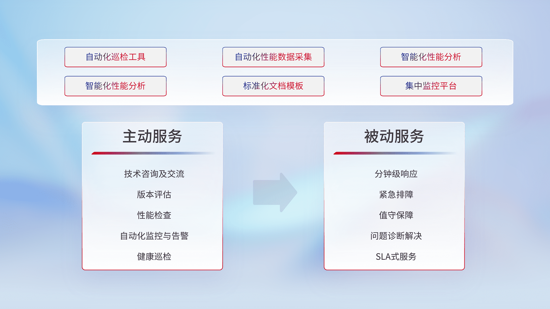 智能化工具和标准化文档,,,保障服务质量,,,提供主动服务(包含技术咨询、、、、版本评估、、、性能检查、、自动化监控与告警、、、健康巡检)和被动服务包含(分钟级响应、、、紧急排障、、、值守保障、、、、问题诊断解决、、SLA服务)。。。。